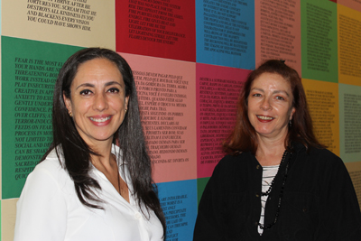 Magnolia Costa e Ciça Bueno no corredor do MAM, onde ocorre o “ Projeto paredes”, com Jenny Holzer.